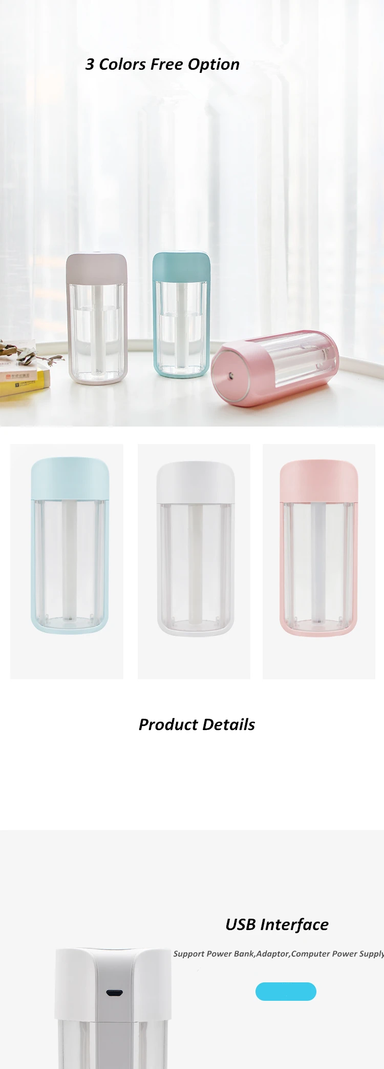 Материал: АБС + ПП + силиконРезервуар для воды: 260 млРазмер: 75*62,9*160 ммЦвет: белый/розовый/синийМощность: 2 ВтНапряжение: DC5VСоединяет пути:1. Зарядное устройство для телефона2. Дополнительный внешний аккумулятор3. Usb-порт для ноутбукаПосылка включает в себя:1. Увлажнитель * 12.USB кабель * 13. Руководство * 1