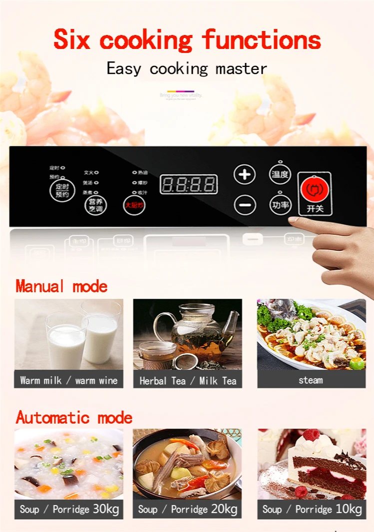 Function: Stir-fry, stir-fry, stewed milk, steaming, porridge, soup, hot pot, boiling water, frying, constant temperature, timed