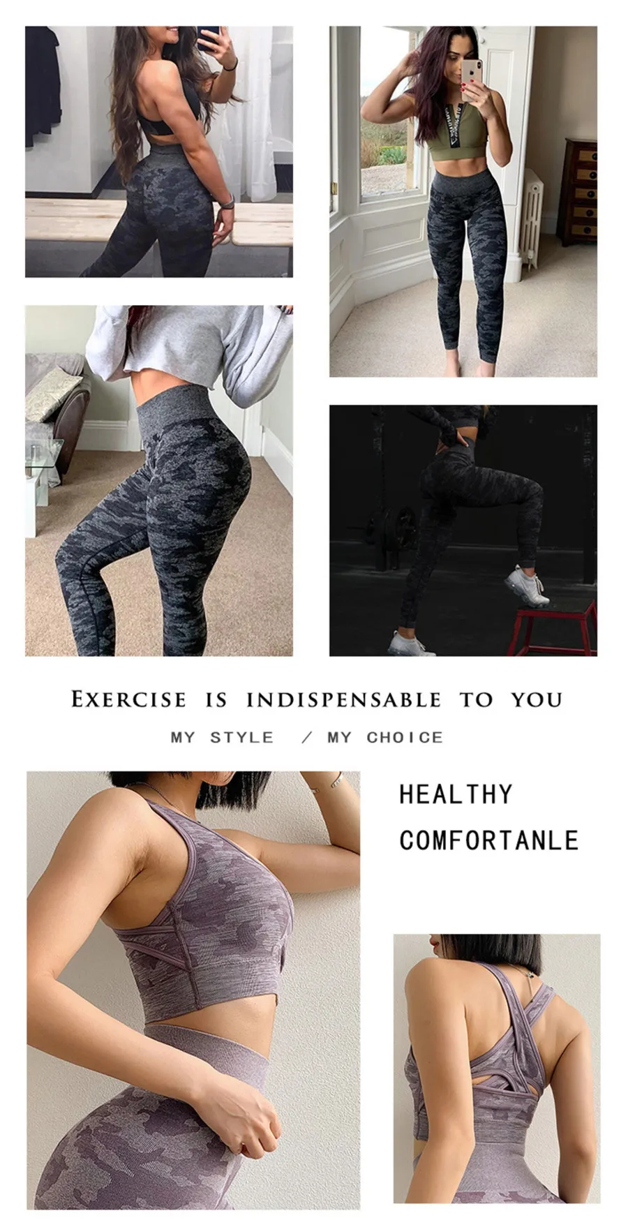 2019 Камуфляжный спортивный костюм для женщин Бесшовные Фитнес Йога бюстгальтер спортивный бюстгальтер + юбка с высокой талией тренажерный зал камуфляжной расцветки, легинсы, штаны для фитнеса, спортивные костюмы.
