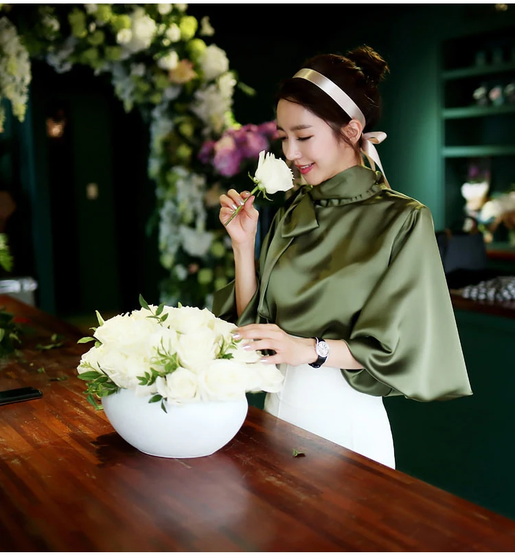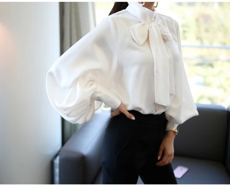 Женский офисный Топ, летняя атласная рубашка с рукавом-фонариком, с галстуком-бабочкой, свободный элегантный халат, винтажная блузка, Топ DV995