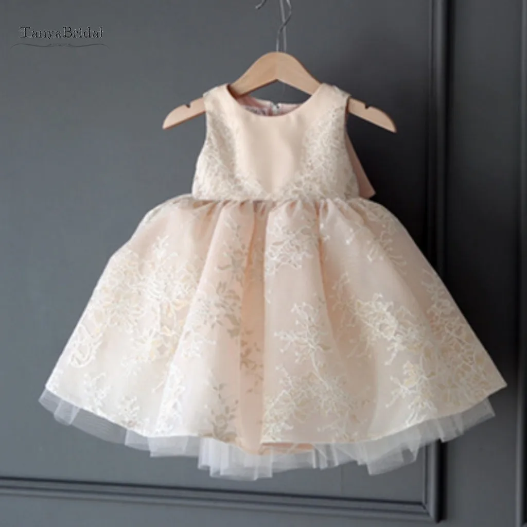 Новые платья для причастия цвета шампанского для девочек, бальное платье без рукавов с круглым вырезом, кружевные платья с цветочной аппликацией для девочек на свадьбу, XF013
