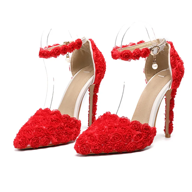 NEW Lace Women Sandals High Heels 11.5CM Women Shoes Sandals Female Shoes Princess Dress Wedding Shoes Red Rose Wedding Shoes