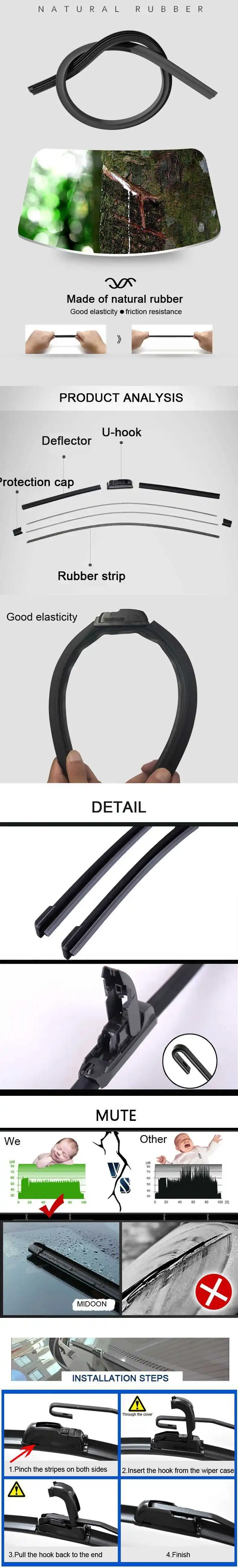 Более четкая видимость. Натяжная арочная сталь хорошо распределяет давление на поверхности лобового стекла и в результате резиновые контакты хорошо сочетаются с ветровым стеклом, что обеспечивает гладкие салфетки и чистящее зрение с небольшим визгом