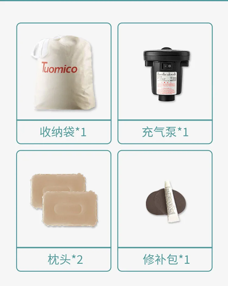 1: сумка для хранения 2: воздушный насос 3: две подушки 4: ремонпосылка