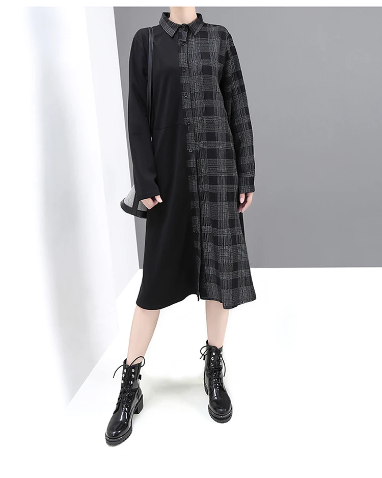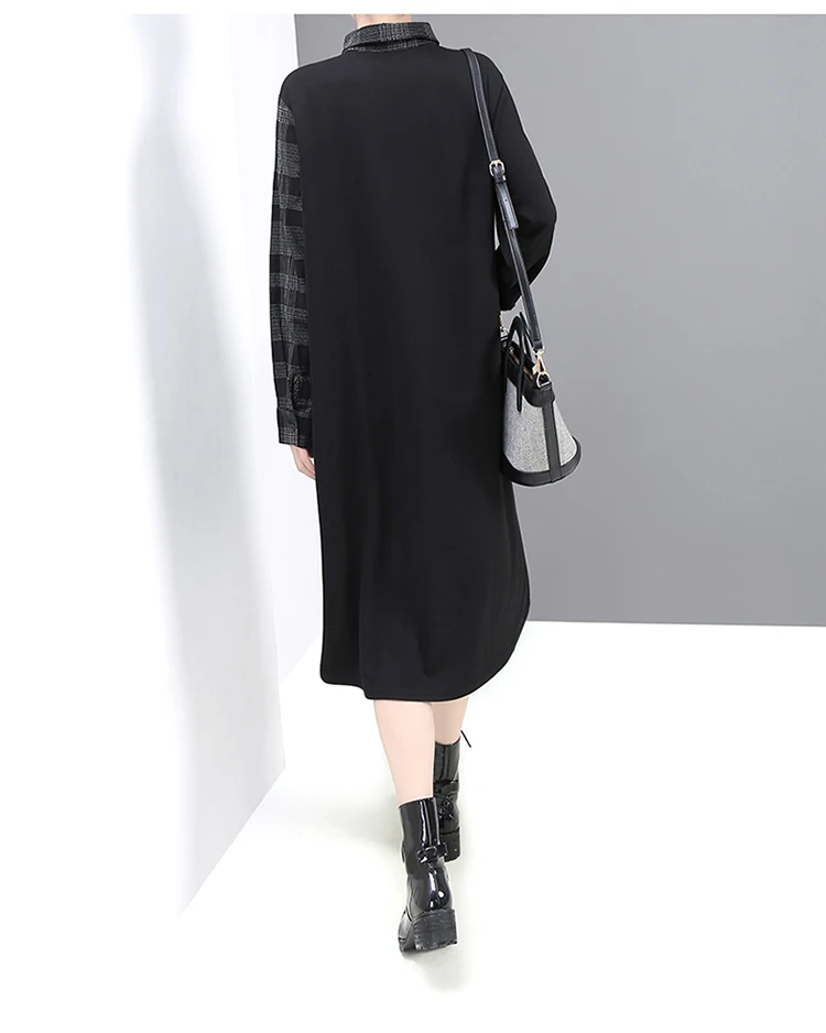 * Новинка 2019, Женское зимнее модное черное платье-рубашка с длинным рукавом и карманами, хит цвета, клетчатое лоскутное женское Повседневное платье миди, халат 5679