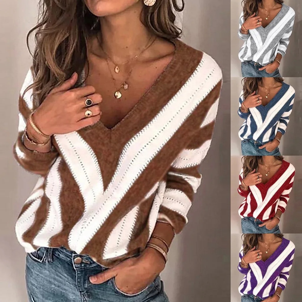 Женский вязаный свитер, повседневный теплый свободный джемпер в полоску с v-образным вырезом, топы, блузки, свитера, 2019