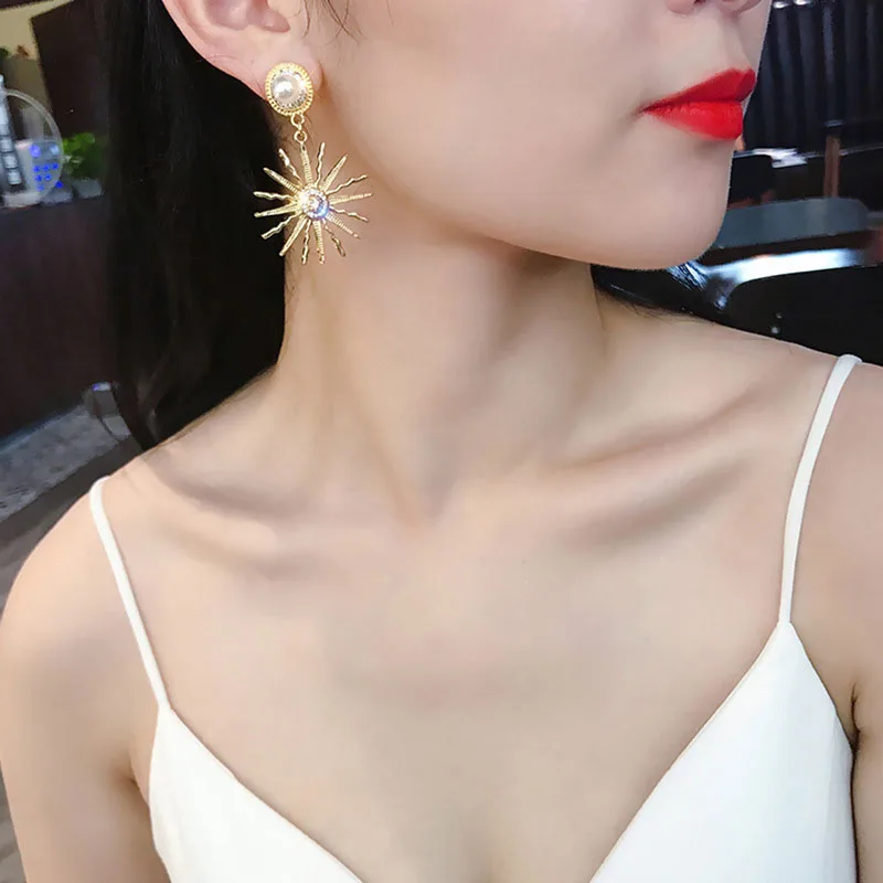 Новые золотые Хрустальный Подсолнух серьги для женщин роскошные барочные серьги с дизайном «солнце» с жемчугом Женские Висячие серьги массивные ювелирные изделия