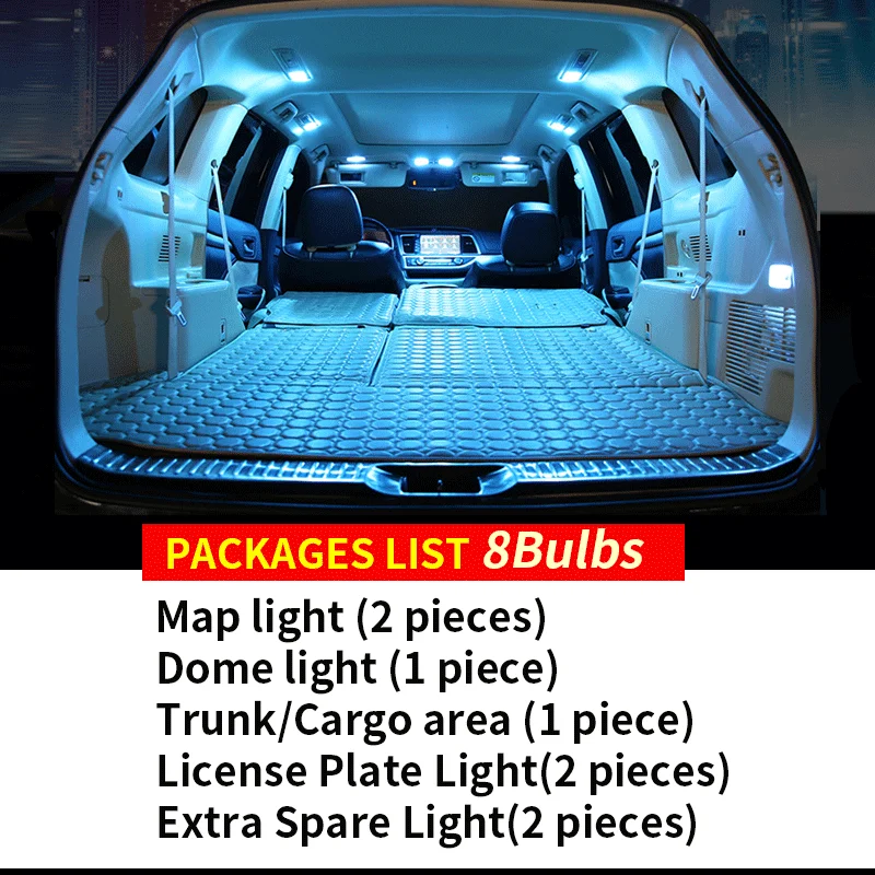 Карточный светильник (2 шт.) Купольный светильник (1 шт.) Багажник/грузовая зона (1 шт.) Светильник для номерного знака (2 шт.) Дополнительный запасной светильник (2 шт.) Все светодиодный лампы поддерживают обмен данными по 100% подключи и играй, без каких-либо изменений.