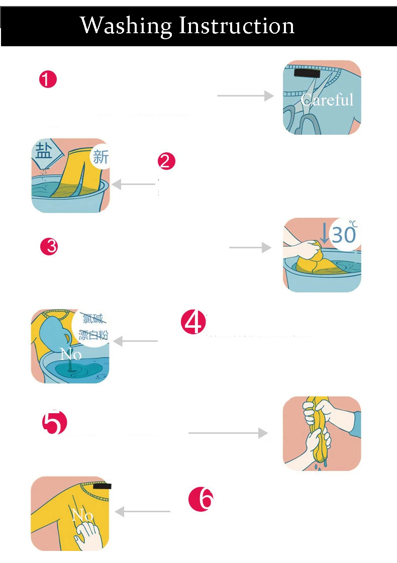 Подробные инструкции по стирке. Например, стирка при температуре не выше 30, не использовать отбеливатель, сушить в подвешенном состоянии, не гладить, не подвергать химической чистке и т. Д.
