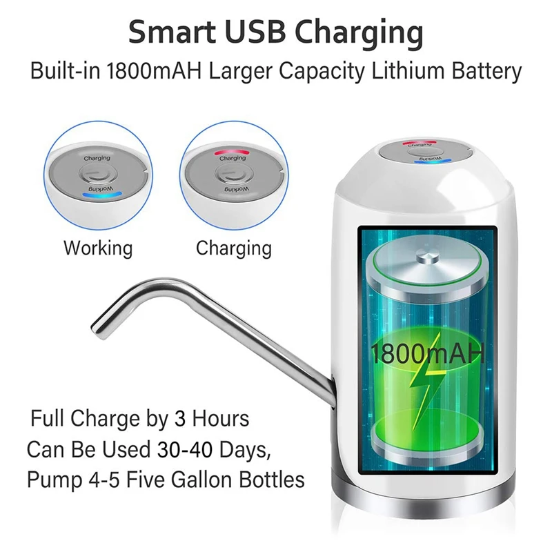 [Usb-раздатчик воды] Встроенный перезаряжаемый аккумулятор емкостью 1800 мАч. Может использоваться в течение 30-40 дней или около 4-5 бутылок воды 5 галлонов после полной зарядки. Не нужно заряжать каждый день. Его можно взять с собой в любом месте для дозирования воды. Используйте его в помещении или на открытом воздухе.