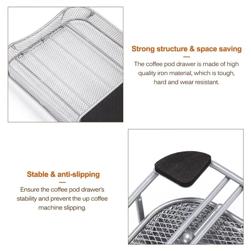 Ящик для кофейных капсул изготовлен из высококачественного железного материала, который является жестким, твердым и износостойким. Ящик для кофейных капсул с прочной структурой может отверстие кофемашины в верхней части и хранить кофейную капсулу в ящике одновременно, что может эффективно помочь вам сэкономить место.