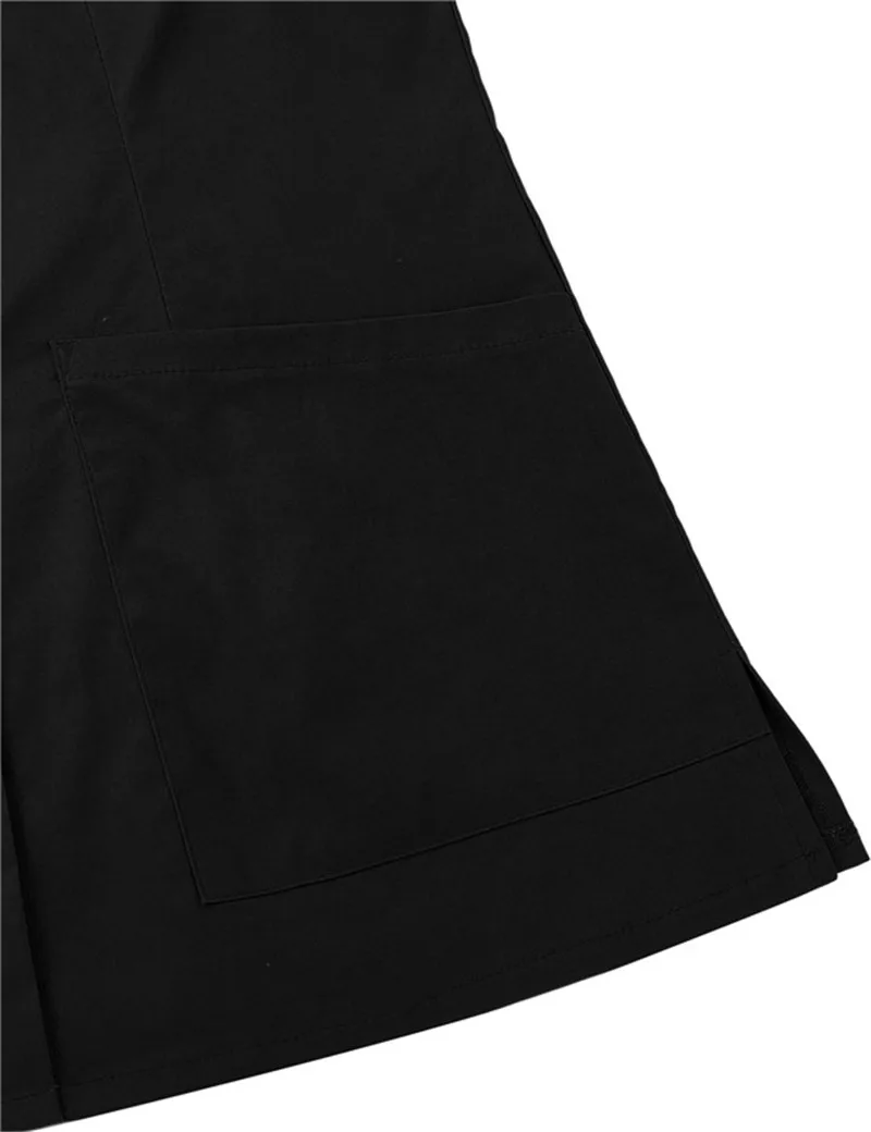 Отложной воротник и короткие рукава с белой окантовкой, 2 нижних кармана и карман для ручки на груди, скрытая застежка на пуговицах спереди.