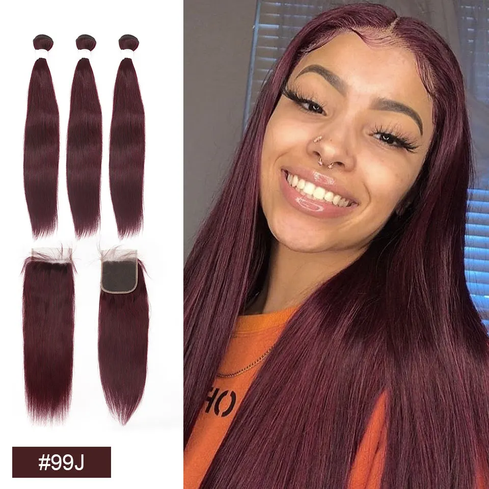 Пучки из натуральных волос 99J красного бордового цвета 3 пучка с застежкой