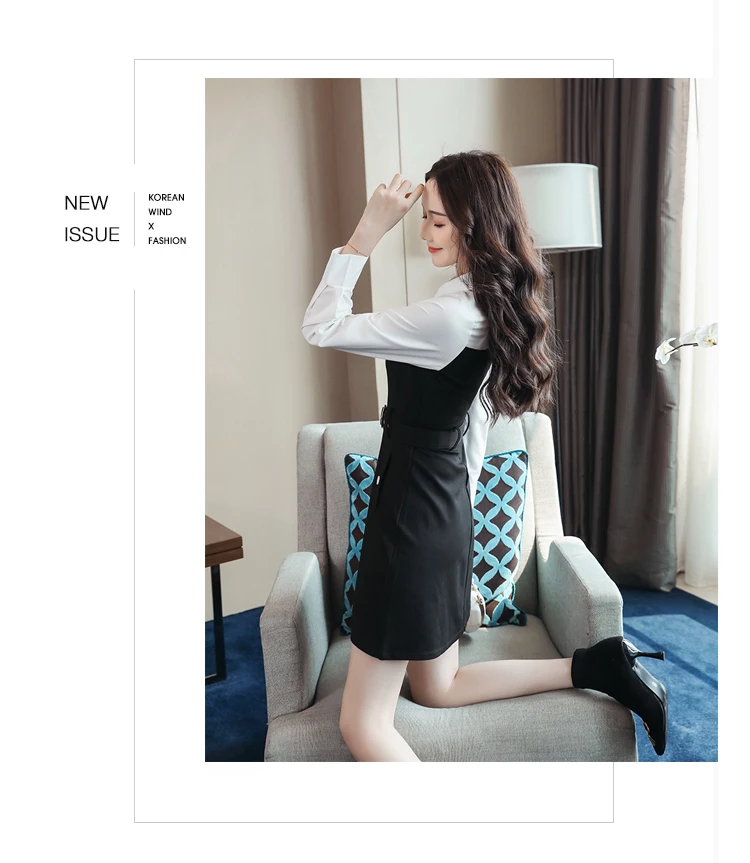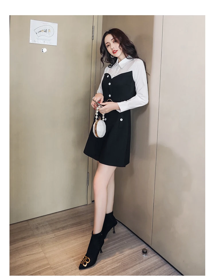 Весенне-осеннее женское офисное черное платье с белым воротником и длинным рукавом, однобортное платье с поясом, тонкие сексуальные платья DG177