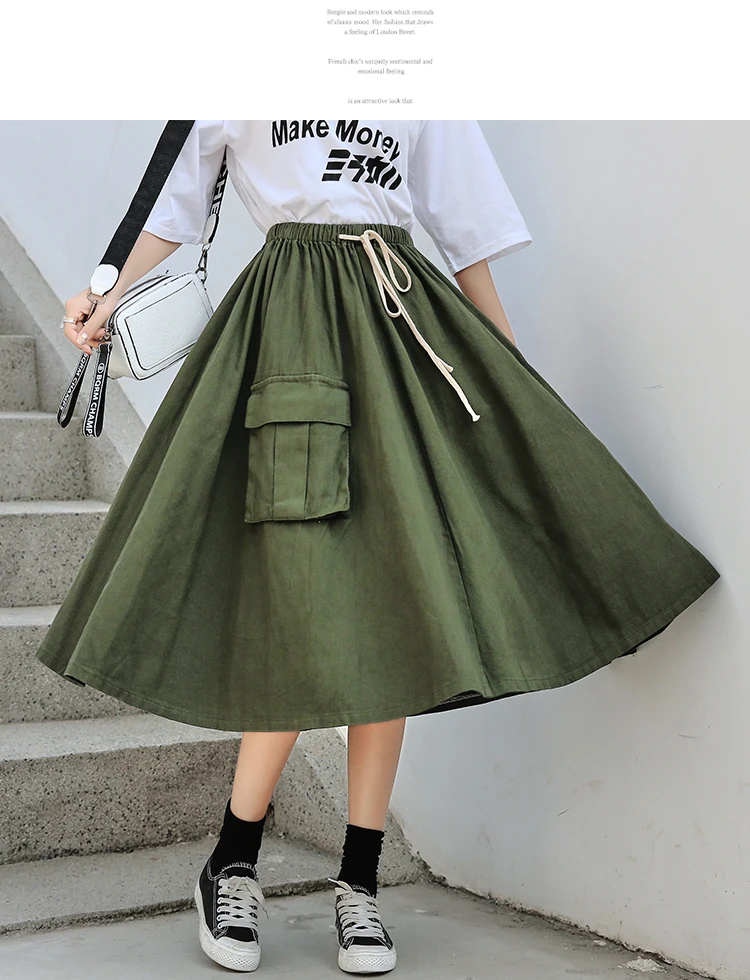 Новинка 2020, летняя женская однотонная Свободная юбка, с карманами, на шнуровке, с бантом, высокая эластичная талия, до середины икры, хит продаж DA699