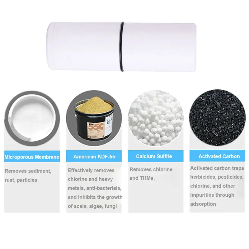 1st из KDF-55 удаляет 99% вредного хлора и ионов тяжелых металлов, таких как Zn2 +,Hg2 +,Cu2 +, cd2. Поговорите с серфидом водорода, свинцом, ртутью, мышьяком и другими металлами через химическую реакцию редокса. Уменьшает воздействие Radon и диспутирует рост формы, грибков и водорослей уменьшает набухание извести и накипи для насадок для душа и сантехники 2-й уровень сульфита кальция значительно уменьшает уровень хлора и других вредных веществ в вашей воде, вы избежите дополнительной интоксикации и улучшите свое здоровье 3rd адсорбирующего хлора с активированным углем, неприятных запахов и других примесей.