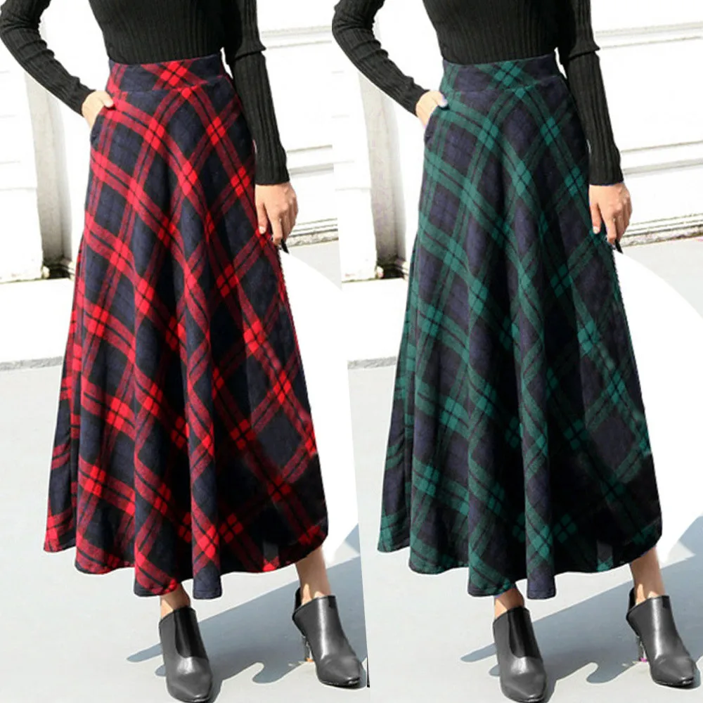 Женская длинная клетчатая юбка-трапеция с высокой эластичной талией, зимняя теплая Расклешенная юбка до щиколотки