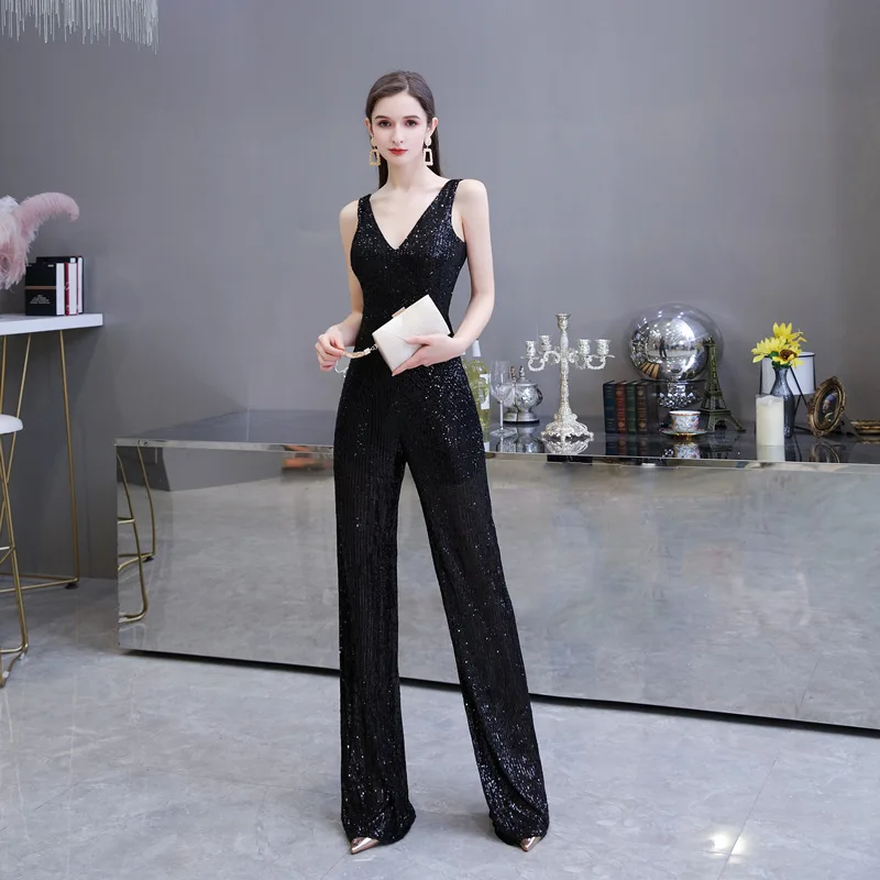Черные Вечерние брюки с пайетками 2020, серебристые, с глубоким v-образным вырезом, с открытой спиной, на молнии, платье, сексуальные, без рукавов, Длинные вечерние костюмы, строгие брюки для выпускного вечера