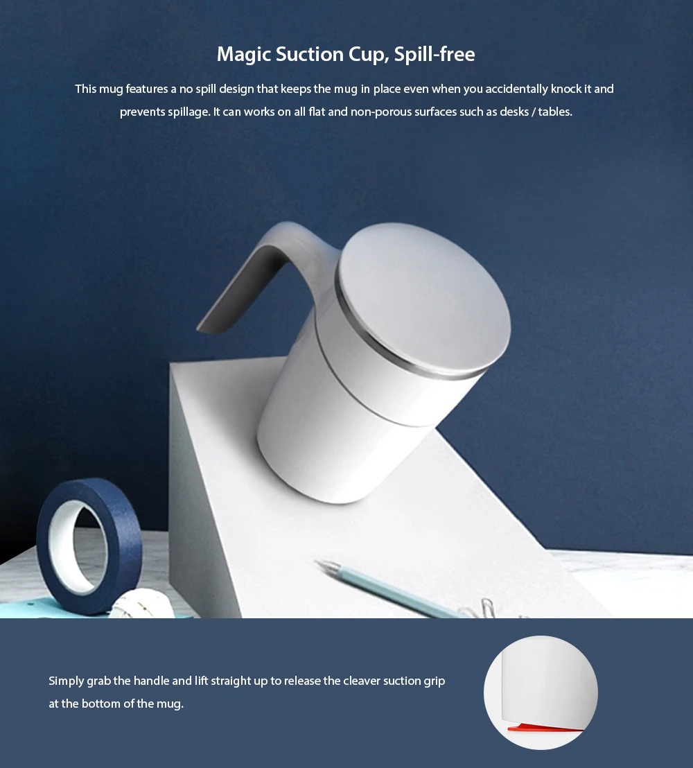 Xiaomi 470 мл инновационная не разливающаяся чашка, Волшебная присоска, защита от брызг, не скользит, АБС двойная изоляция, 304 из нержавеющей стали, от Xiaomi Youpin Примечание: Это экологическая цепная продукция Xiaomi, на ней нет логотипа Xiaomi. Описание продукта: Кружка без проливания поможет вам решить ваши проблемы и избежать всех неприятных ощущений. С силиконовой крышкой уплотнения вам не нужно беспокоиться об утечке. Если вы случайно Постучитесь в него, кружка не опрокинется. Паз кружки позволит избежать капель жидкости на дно в то же время. Это может защитить ваш ноутбук или даже важные документы от воды и привнести много удобства в вашу жизнь. Основные Особенности ● Конструкция без проливания удерживает кружку на месте и предотвращает проливание даже при случайном стуке ● Поднимите прямо вверх, чтобы высвободить Кливер всасывающий захват в нижней части ● С двойной стеной изоляции поддерживает температуру жидкости в течение длительного периода времени ● Емкость 470 мл, идеально подходит для дома, офиса ● Работа на всех плоских и непористых поверхностях, таких как стол или столы.