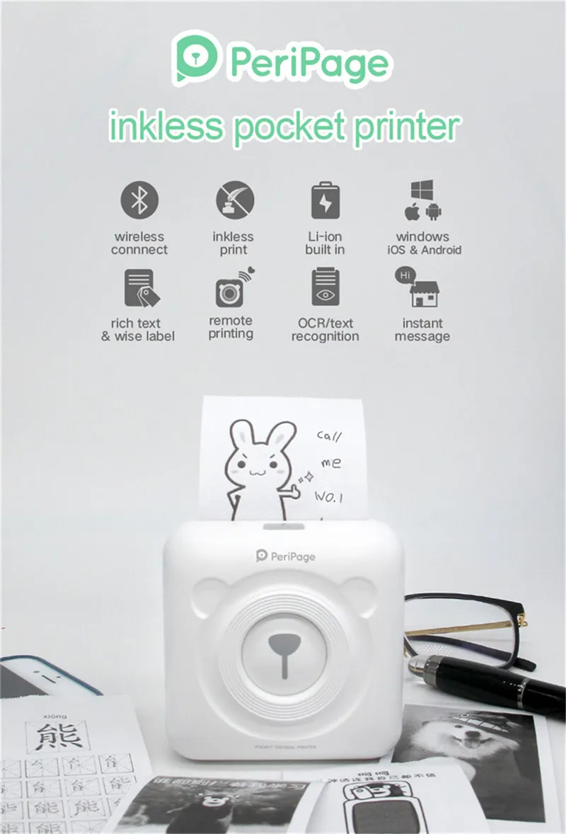 С технологией термопечати и высококачественной печатной головкой, принимает тепловую бумагу вместо чернил, она, как правило, более Тихая, быстрая и более Энергоэффективная, поддерживает быструю зарядку через USB