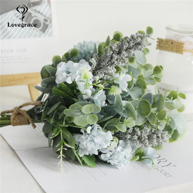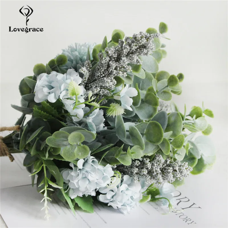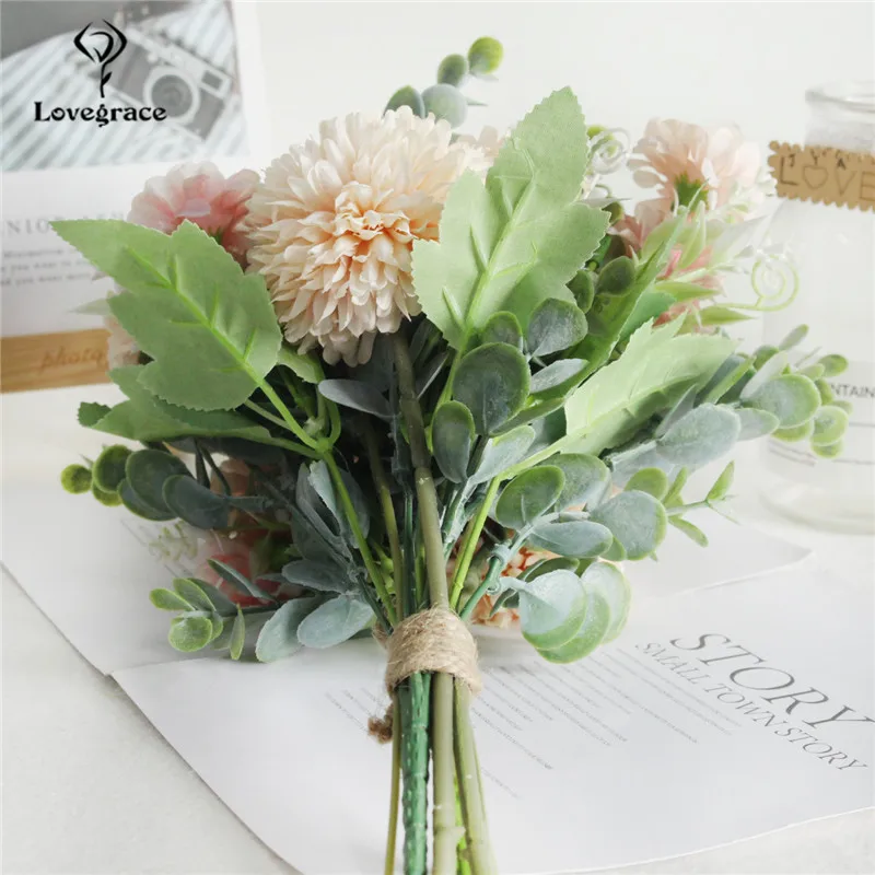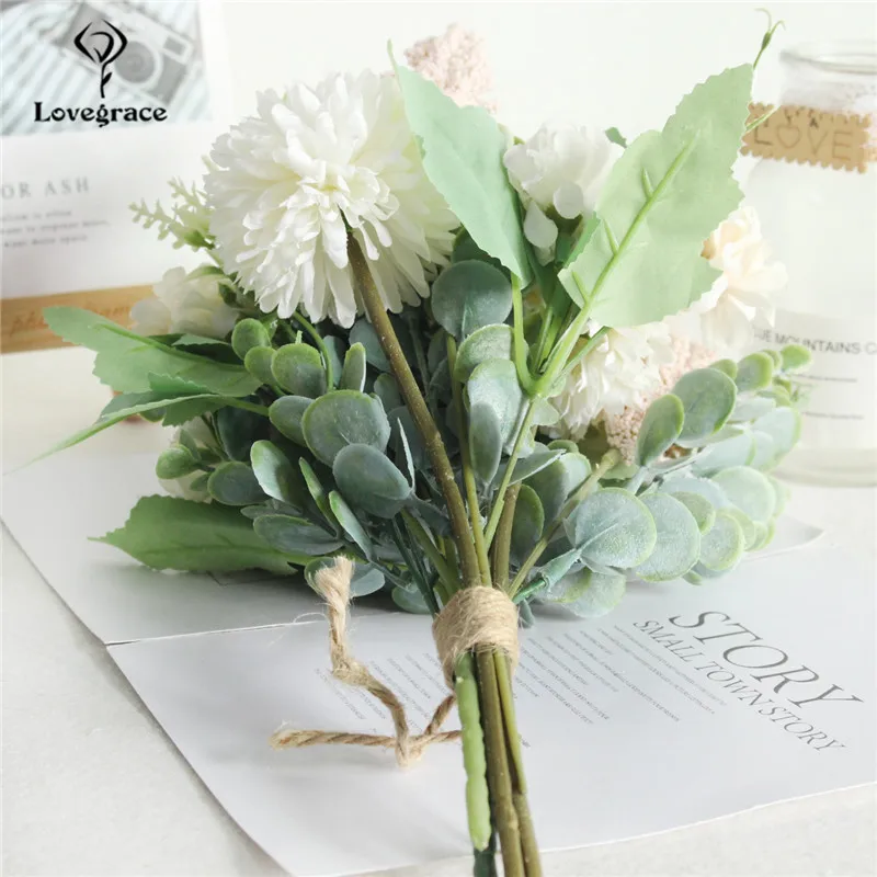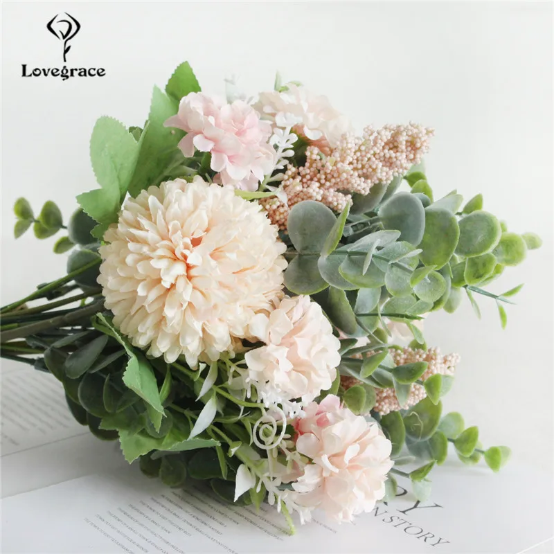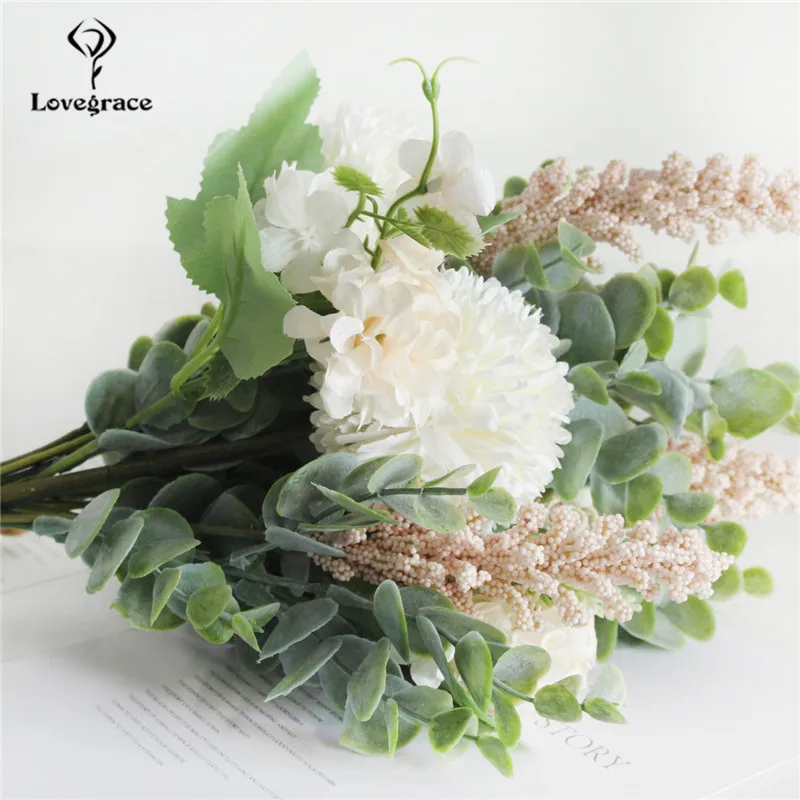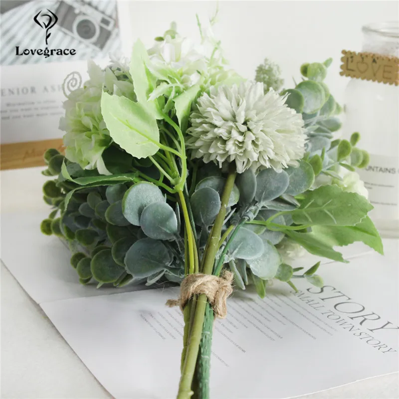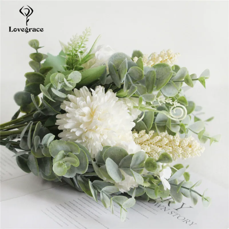 Lovegrace Artificial Silk Pompon Luckyball Flowers Bouquet Green Eucylaptus Silk Flores Wedding Bouquet Home Party DIY Decor Fake Flowers