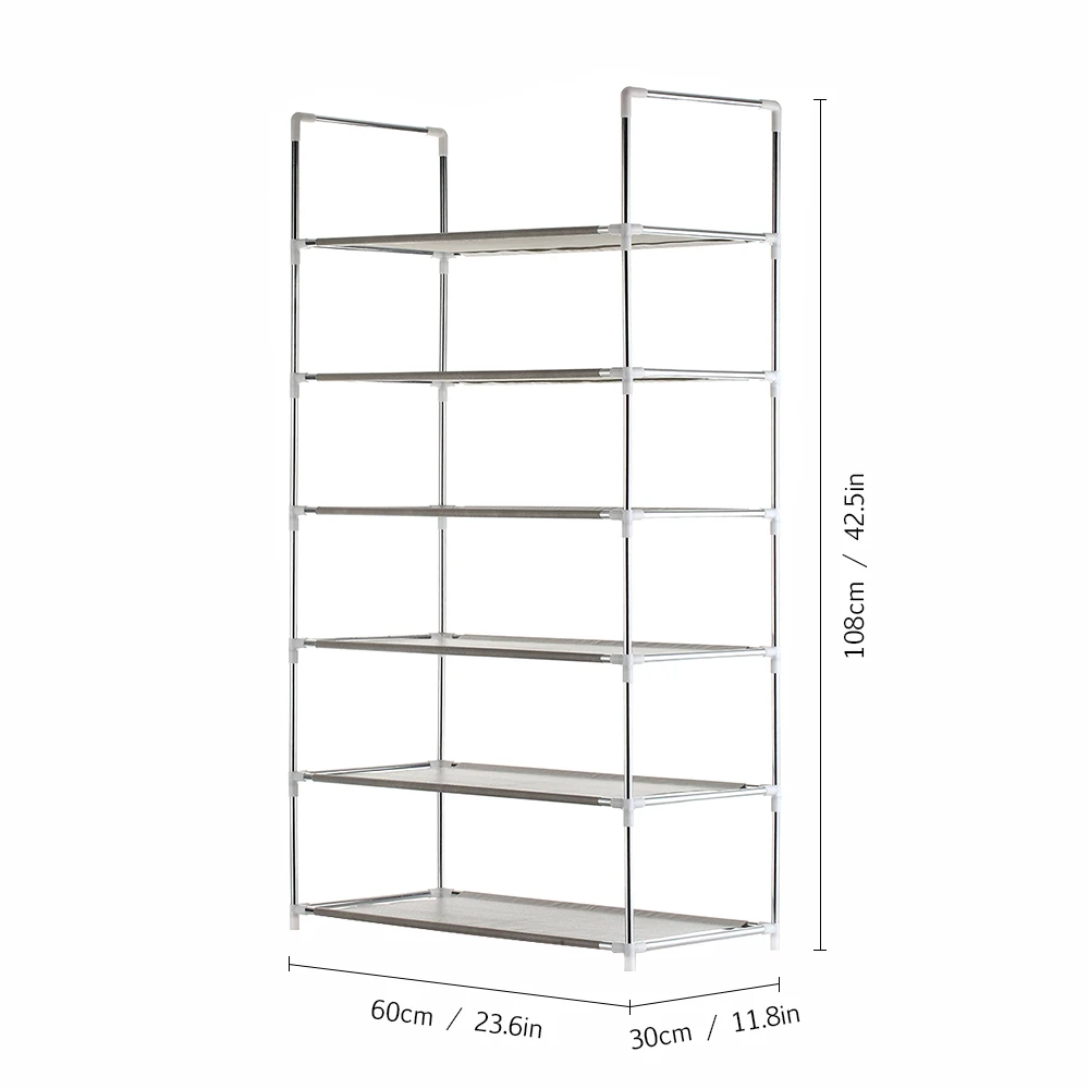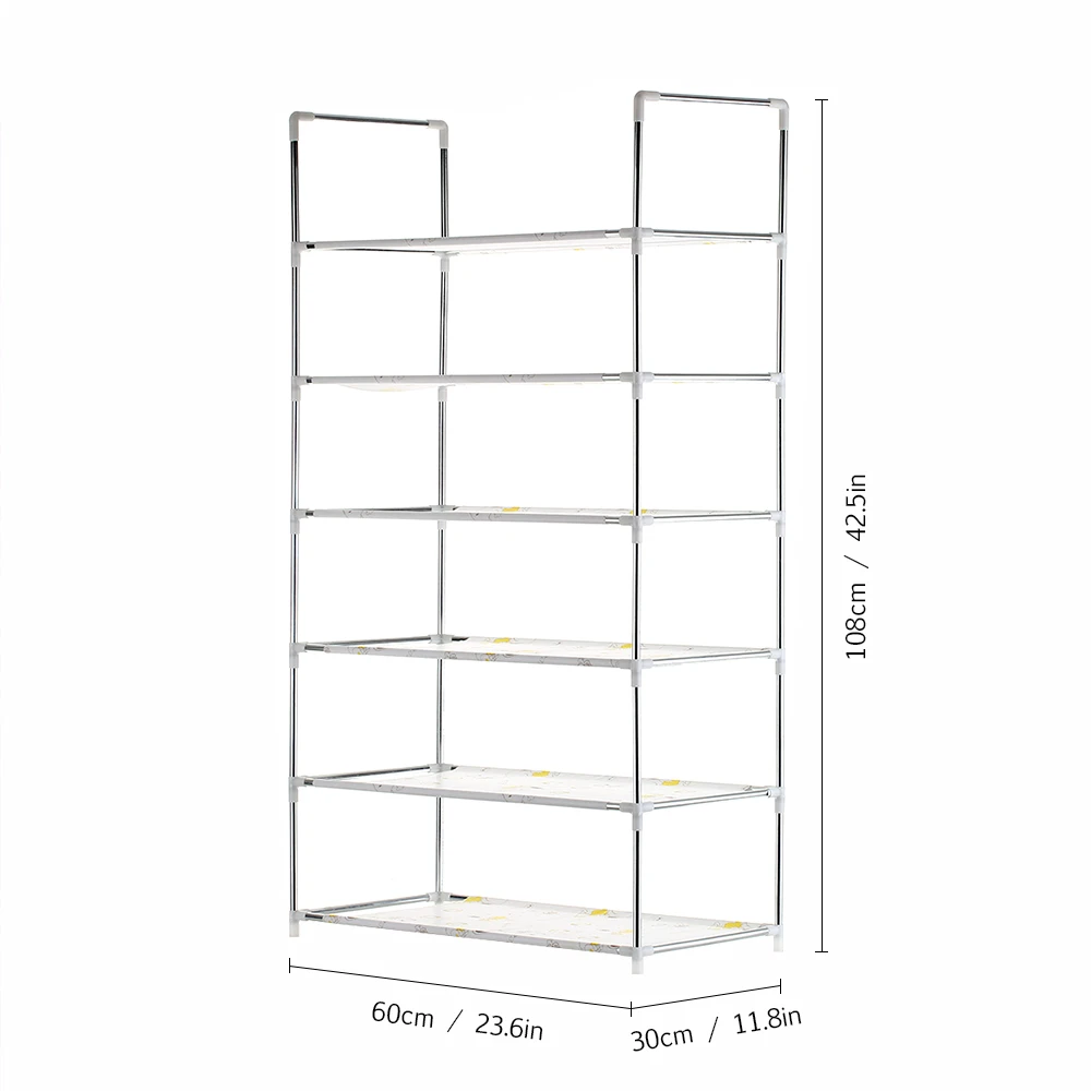Храните обувь с помощью этой стойки для обуви, которая обеспечивает отличное решение для хранения вашей коллекции любимой обуви. Он изготовлен из прочных железных труб, нетканого полотна и пластиковых разъемов. Каждая полка вмещает до 3 пар полноразмерной обуви. Это приличная стойка для хранения обуви и хорошо впишется в дверной проем, прихожую, спальню, шкаф и так далее. Эту компактную стойку для обуви можно также поставить в угол или в зал.