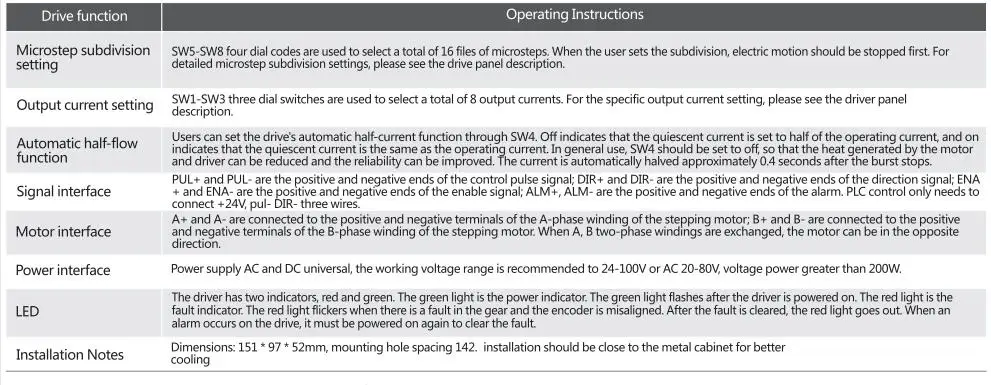 На основе 32-битной платформы обработки ARM, с использованием внутреннего алгоритма управления ПИД током, с Отличная производительность. Встроенная технология микросегментации и функция автоматической настройки Параметры включения делают драйвер низким уровнем шума, низкой вибрацией, низким нагревом и Высокоскоростная Высокая выходная мощность и может быть хорошо адаптирована к большинству применений шаговых двигателей. : Особенности: Импульсный режим: одноимпульсный/CW/CCW импульсный Уровень сигнала: 5 В/24 В отдельная проводка, простая и практичная, сильная способность анти-помех. Типичные применения: машина для зачистки, маркировочная машина, машина для резки, лазерное оборудование, визуальное Позиционирование, автоматическое оборудование и так далее. Эффект применения особенно хорош в устройстве Где пользователь хочет высокую скорость и небольшой шум.
