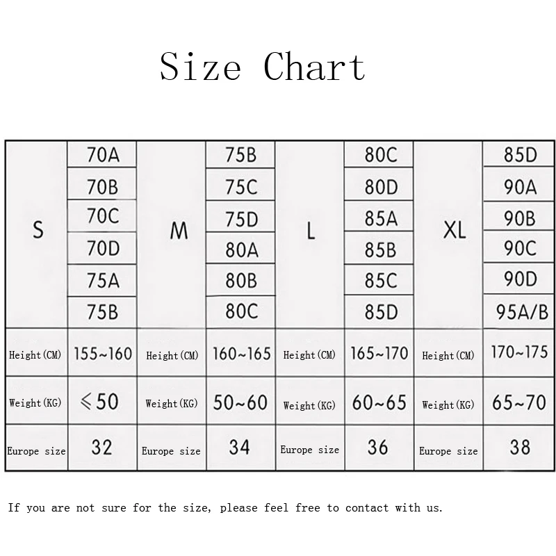 Размер чашки: s m l xl S подходит для: 70A 70B 70C 70D 75A 75B M костюм для: 75B 75C 75D 80A 80B 80C L костюм для: 80C 80D 85A 85B 85C 85D XL костюм для: 85D 90A 90B 90C 90D 95A 95B