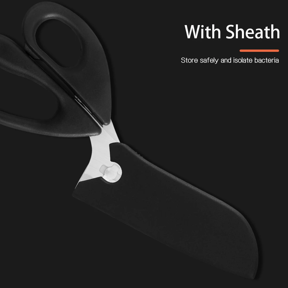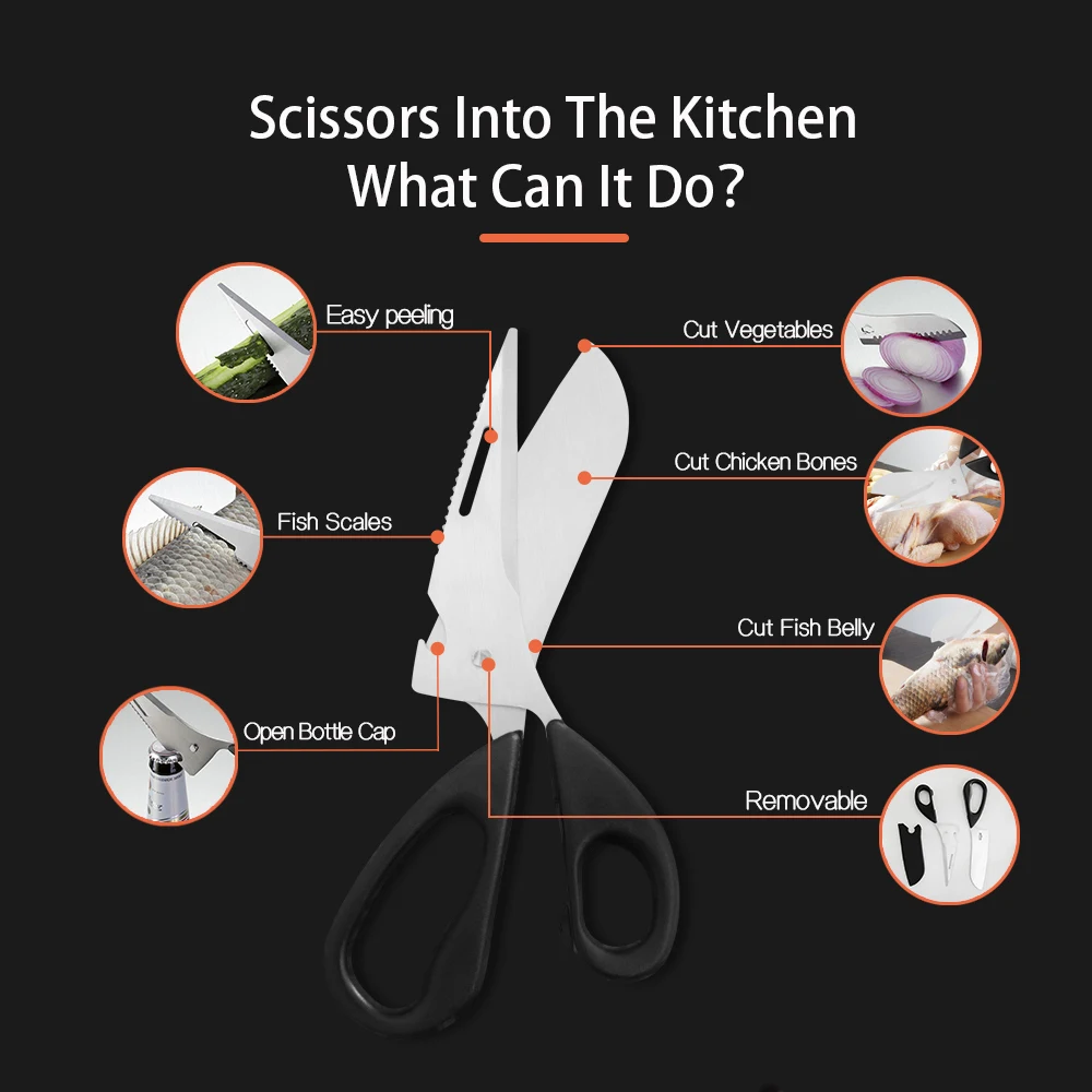 【EFFICIENCY BOOSTER】-Многофункциональные кухонные ножницы улучшают эффективность приготовления пищи, экономя время, чтобы переключиться назад и вперед между различными инструментами. Они не только хорошиРезка сырого мяса, соскабливание рыбных весов, растрескивание орехов, измельчение трав и овощей, Но иПилинг фруктов и открывающиеся бутылки.
