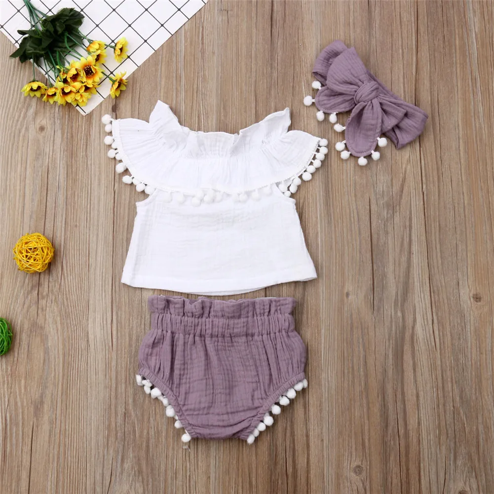 Lovely Baby Girls 3Pcs Outfit Set !! High quality and Brand new 100% Main Color: AS The Picture New in Fashion Material: Cotton and LinenAttention plz: If your kid is chubby, we recomend choosing a larger size, thanks. Please kindly refer to your kids actual height and the size chart before buying/bidding. Thanks. Package included: 1x Top T-Shirt + 1x Shorts + 1x Headband Size Chart: