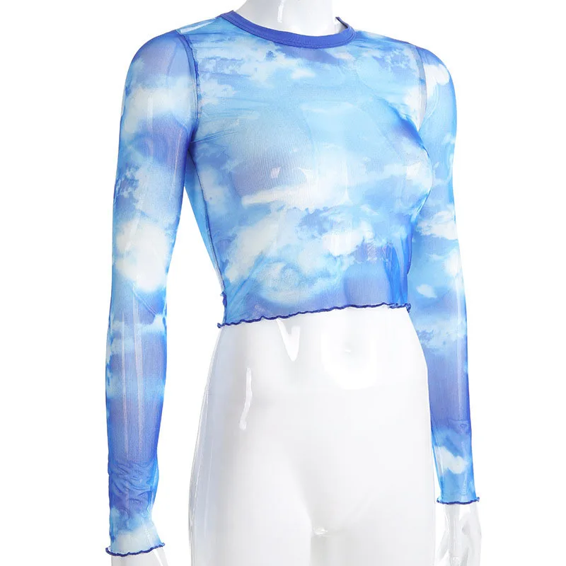 Модные сетчатые Топы с длинным рукавом, женские голубые небесно-белые футболки с принтом облаков, сексуальные прозрачные футболки с круглым вырезом