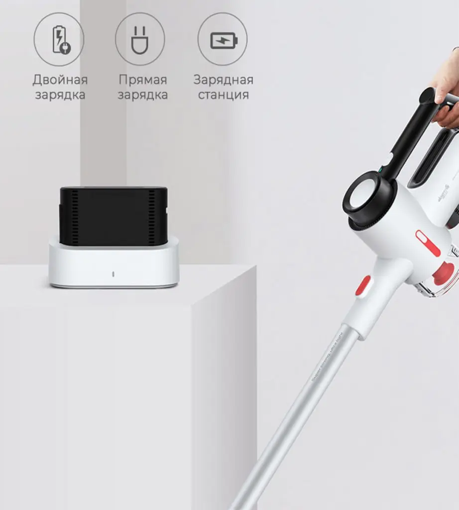 Инженеры Xiaomi разработали два удобных способа зарядки пылесоса: напрямую из розетки и через зарядную базу. Для Вашего удобства, в комплектацию пылесоса входят все необходимые детали для подключения устройства к источнику питания.