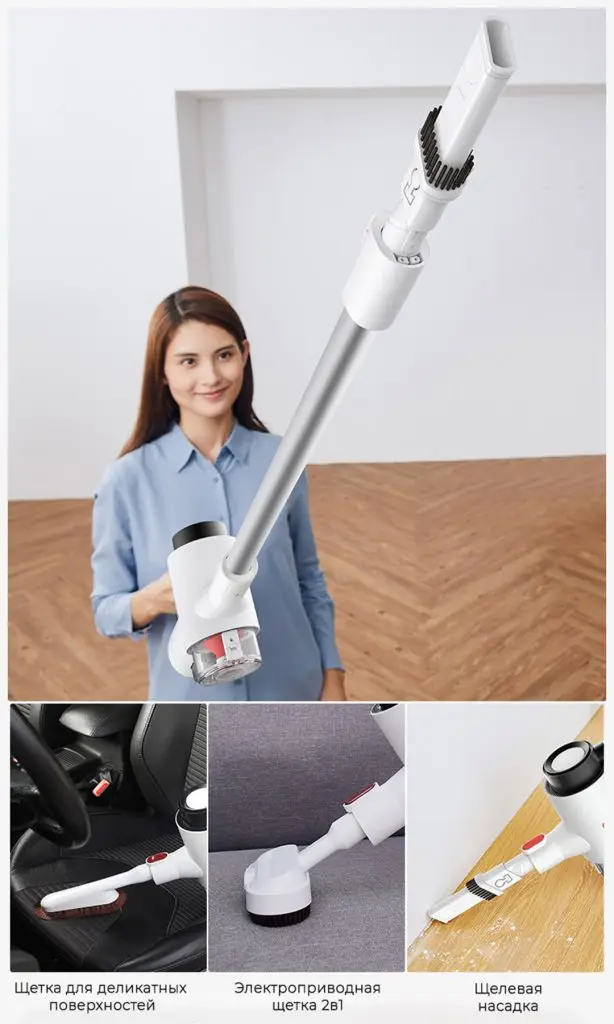 В комплектацию устройства также входят электроприводная щетка 2в1, щетка для мягкой мебели и специальная щелевая насадка. Благодаря такому разнообразию, Вы всегда сможете выбрать подходящий «инструмент» для уборки различных поверхностей. К примеру, мягкая щетка хорошо подходит для уборки кожаных кресел в автомобиле, а щелевая насадка отлично справится с пылью в углах комнаты.