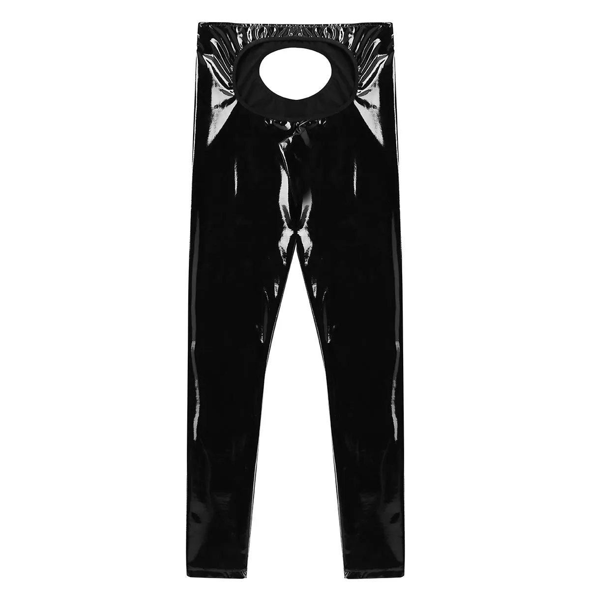 Мужские брюки-леггинсы из лакированной кожи, облегающие, надеваются на застежку.
