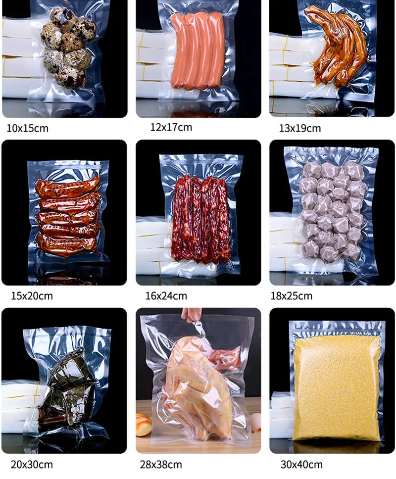 Nylon material, food preservation bag Need to extract air from bag with air extractor Size:(The Add 3/4cm is means the above of the zip lock) 6*8cm 7*10cm 8*10cm 8*12cm 9*13cm 10*15cm 12*18cm 13*19cm 14*20cm 16*24cm 17*25cm 18*25cm 18*26cmc 20*25cm 20*30cm 22*32cm 24*36cm 26*38cm 25*40cm 30*40cm 32*45cmc 35*50cm 40*50cm 40*60cm 45*60cm (More size plz contect us) Quantity:100pcs/200pcs