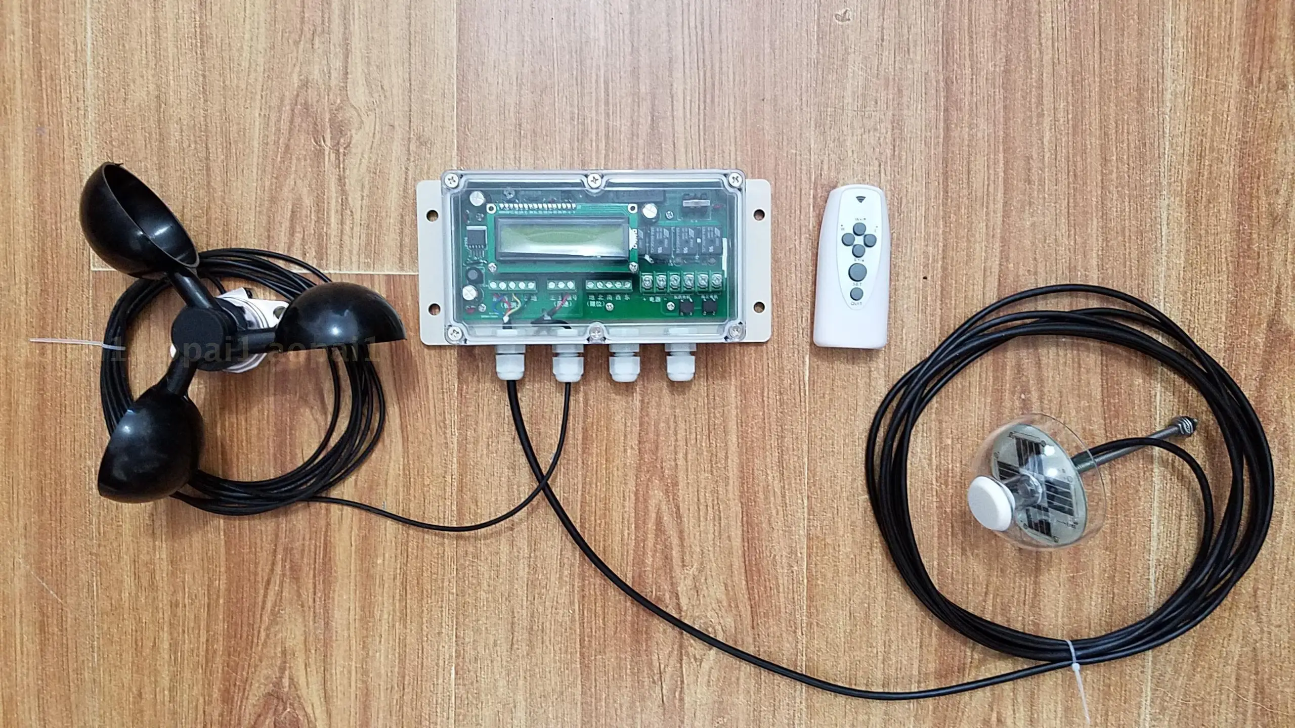 Блок управления имеет водонепроницаемый чехол с прозрачной верхней крышкой. Встроенный микрокомпьютер с одним чипом, схема состоит из таких компонентов, как жидкокристаллический экран дисплея, пятиядерный сигнал, введенный головкой обнаружения, согласно встроенной программе Схема, в соответствии с соответствующей ситуацией, делает соответствующее выполнение драйвера, его интерфейсы соответственно являются головкой обнаружения пятиядерных сигналов, сигналом датчика скорости ветра, сигналом беспроводного дистанционного управления, входом питания, выход двигателя на восточном и западном валах, выход двигателя на северной и южной оси, Д. 。