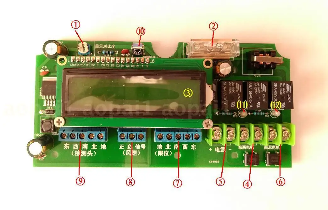 1. Дисплей контраст2.Предохранитель3.Жидкокристаллический дисплей4.Выход двигателя вала востока и запада5.Мощность Вход (12-24VПостоянный ток, левый положительный правый отрицательный)