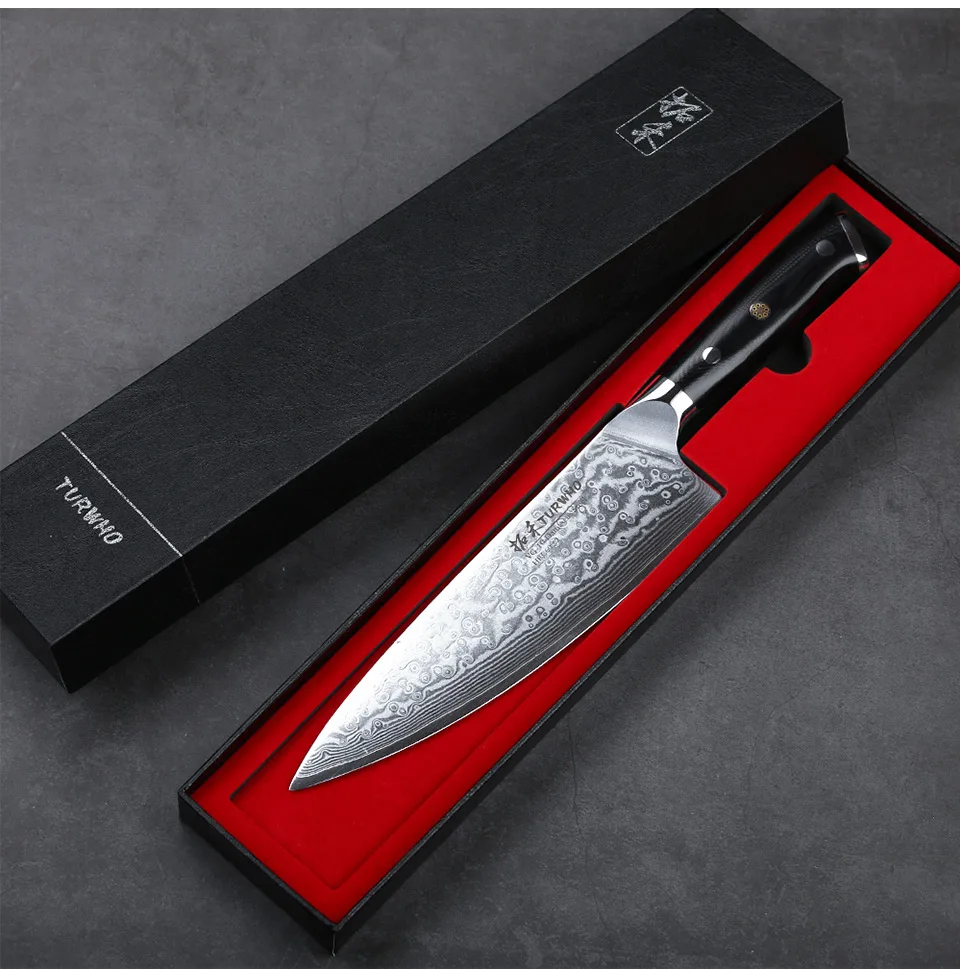 Технические характеристики: * 8-дюймовый кухонный Ножи * Вес (только товар): прибл. 262 г * Материалы: VG-10 Дамасская сталь * Тройная заклепочная Ручка G10 * Пожизненная Гарантия О TURWHO/нож шеф-повара