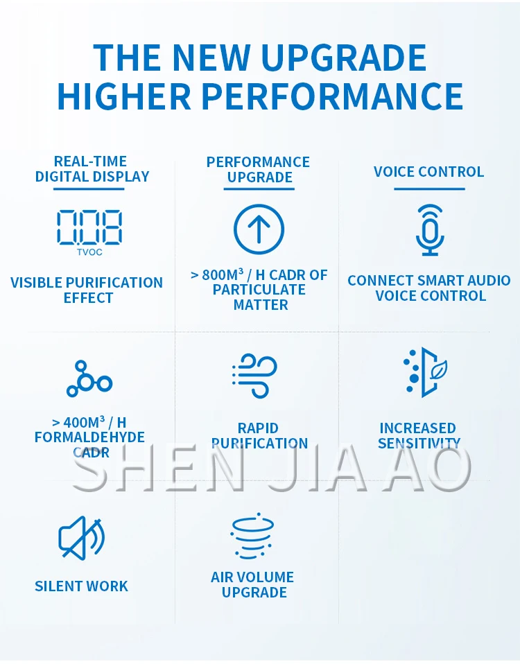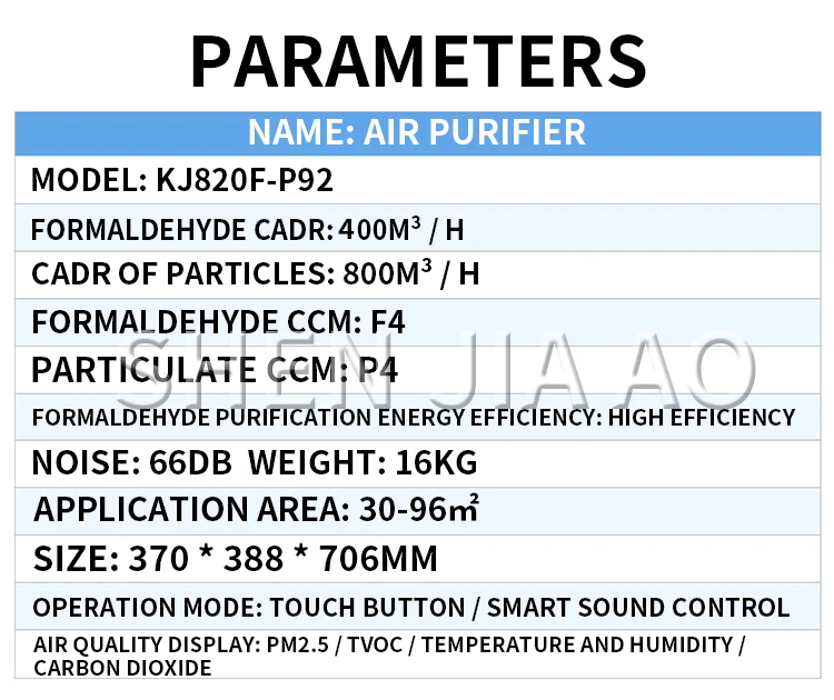 Название: очиститель воздуха Модель: KJ820F-P92 Формальдегид кадр: 400м 3/ч Кадр частиц: 800м 3/ч Формальдегид CCM: F4 Твердые частицы CCM: P4 Энергетическая эффективность очистки формальдегида: высокая эффективность Шум: 66 дБ Область применения: 30-96 ㎡ Размер: 370*388*706 мм Вес: 16 кг Режим работы: сенсорная кнопка/умное управление звуком Дисплей качества воздуха: PM2.5/TVOC/температура и влажность/углекислый газ