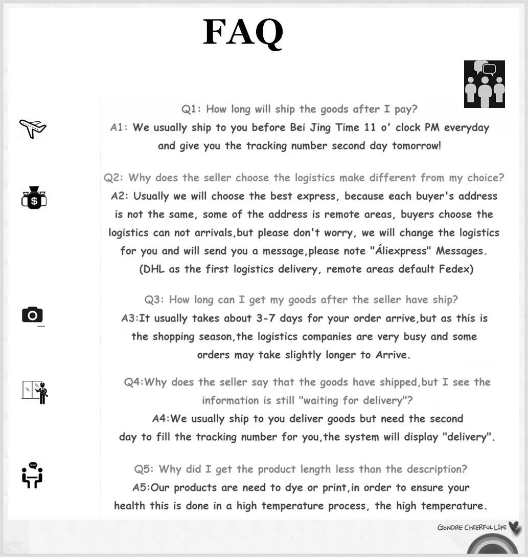 Посылка будет в основном отправлена EMS в течение 3 рабочих дней после получения оплаты. Обычно прибытие занимает 7-10 рабочих дней, но в некоторых странах это может быть немного дольше из-за праздников или таможни, эффективности местной отправки или по другим причинам, поэтому, пожалуйста, подумайте перед выбором. Как правило другим службам требуется всего 3–7 дней. Пожалуйста, сначала свяжитесь с нами, если вы хотите отправить по DHL, UPS, Fedex или другим транспортным компаниям.