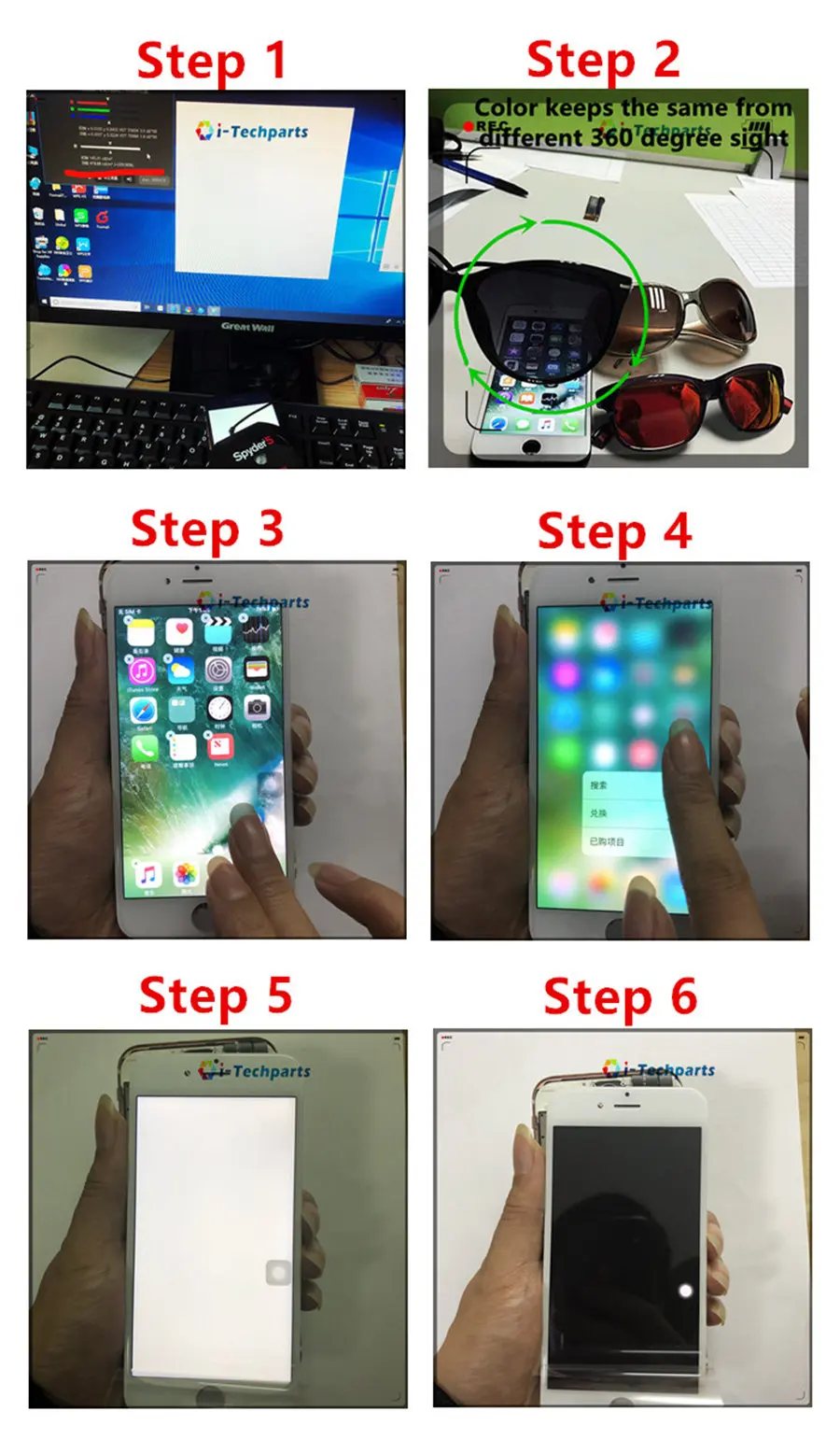 1. Наши размеры и характеристики экрана такие же, как «оригинальный экран», наш экран и оригинальный экран 1: 1. Не только это, цвет нашего экрана совпадает с оригинальным экраном. 2. Мы используем широкую цветовую гамму и оригинальную подсветку, чтобы идеально сочетать, чтобы представить лучший угол обзора и оригинальное 3D касание. 3. Технология inCell также является Основной особенностью нашего экрана, Мультитач, так что ваше прикосновение удобно, не застревает. 4, кроме того, поверхность экрана имеет анти-отпечаток пальца, маслоотталкивающее и олеофобное покрытие, а вода сферическая на поверхности экрана.
