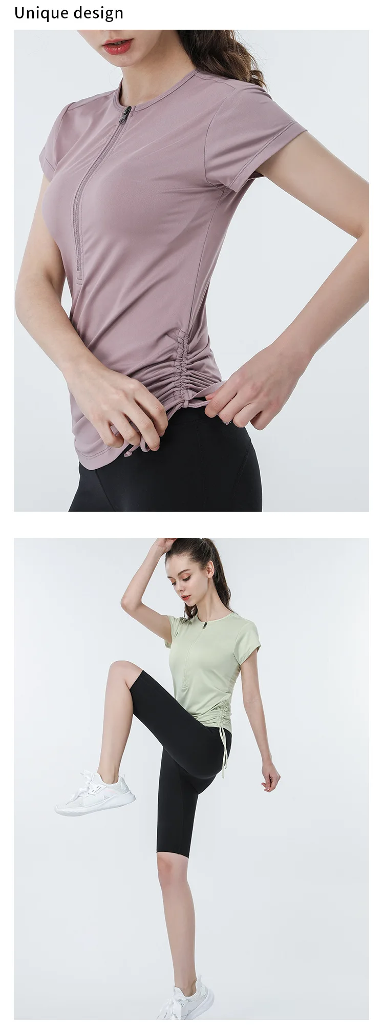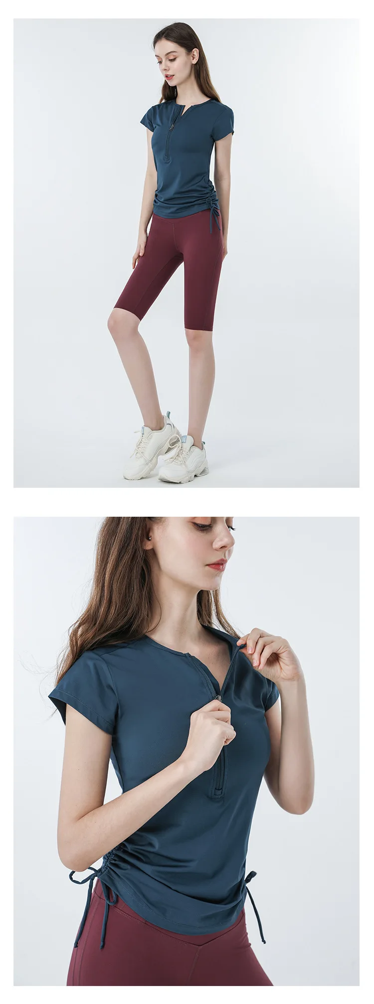 Новинка, Спортивная футболка с коротким рукавом и застежкой-молнией, женский топ для йоги, однотонная быстросохнущая одежда для фитнеса, спортивная одежда для спортзала
