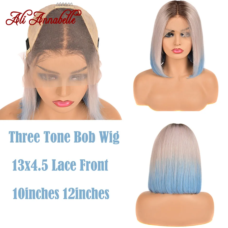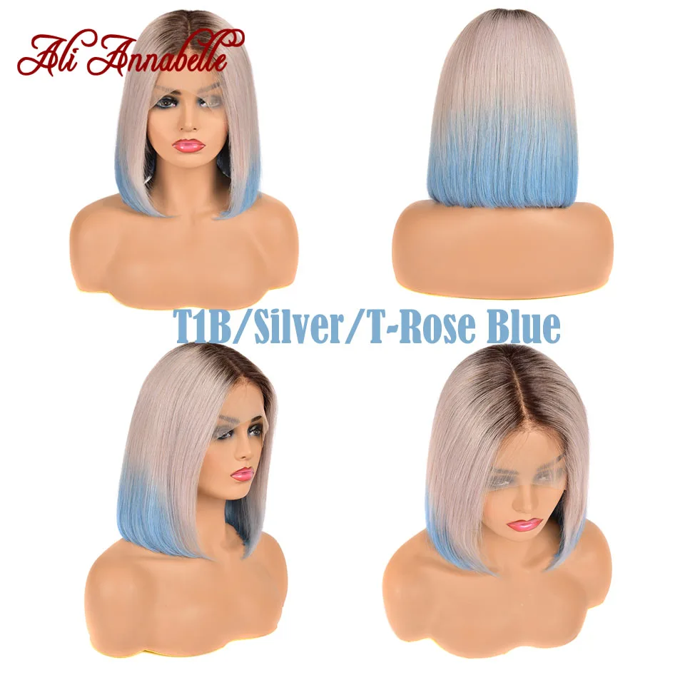 Ali Annabelle малазийские прямые кружевные передние парики, предварительно собранные человеческие волосы, цветные черные, серебристые, розовые, синие, Омбре, Короткие парики для Боба, три тона