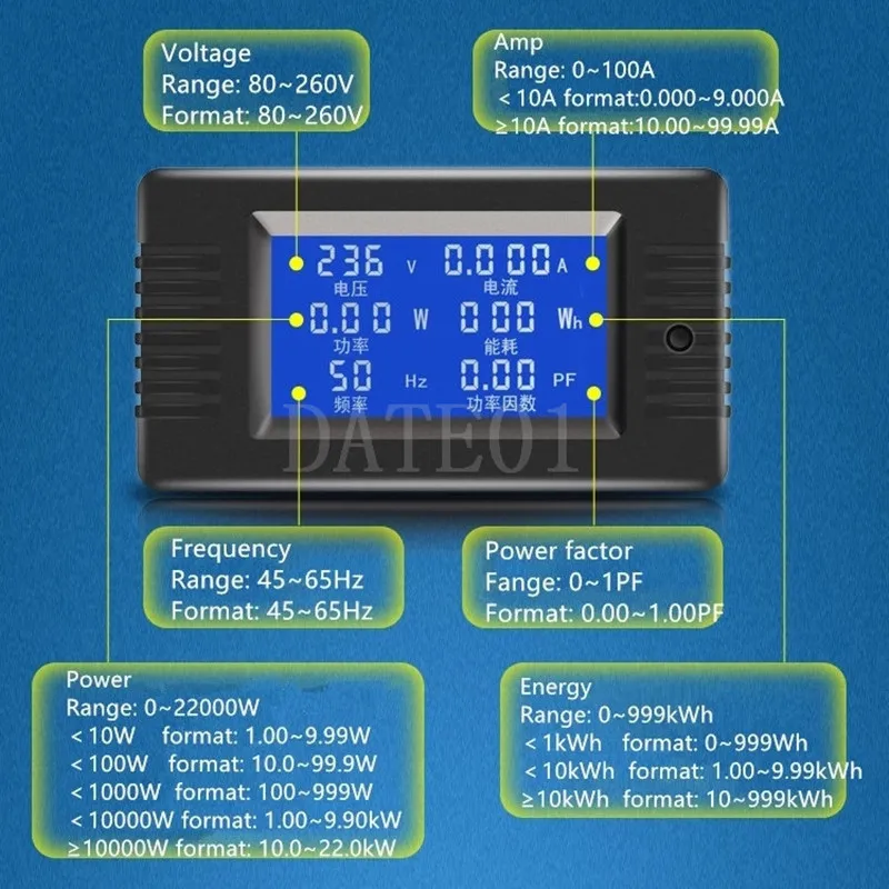 1. Мощность: Диапазон измерений: 0 ~ 22000W, начиная с измерить Мощность: 0,2 W