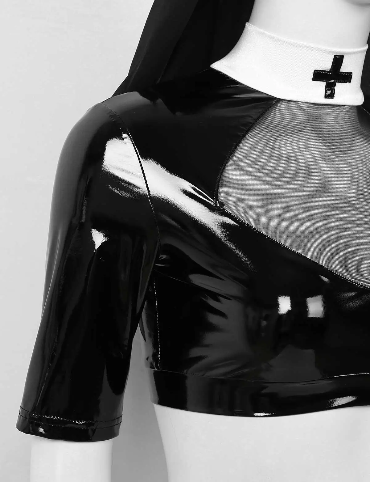 Облегающая мини-юбка с вырезом на шее и полурукавами, с отвесными сетчатыми вставками на груди, застежкой-молнией сзади, с черным крестиком на воротнике и талии.