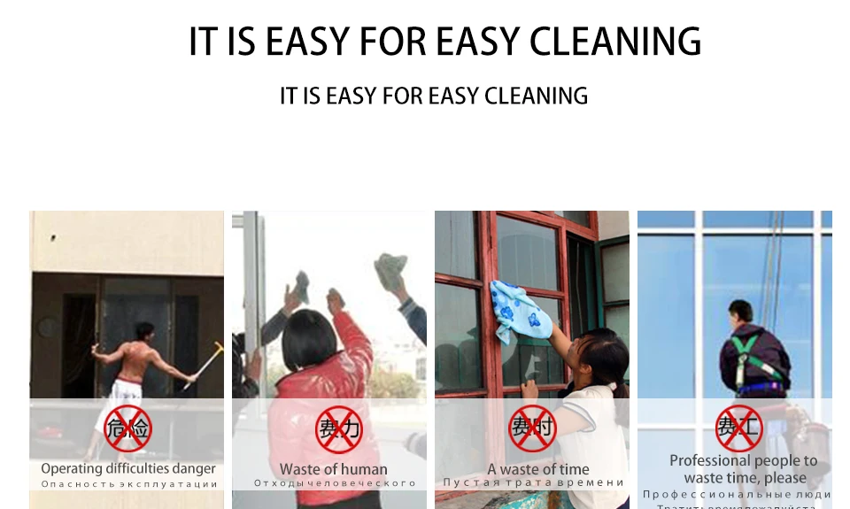 1. Сначала поместите стекло на воду. 2. Поверните устройство для очистки окон, чтобы открыть. 3. Очиститель окон отстой на стекле. 4. Трение вперед и назад. 5. Наклейте впитывающее полотенце на очиститель окон. 6. Протрите окно.