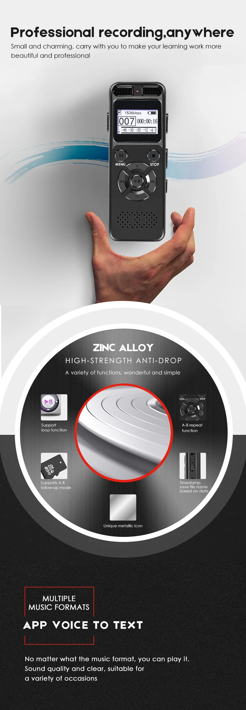 1. Корпус изготовлен из цинкового сплава и устойчив к падению 2. Профессиональный Чип ручки для линейной записи ATJ2129, HD без потерь 3. Поддержка английского, китайского, русского, корейского, японского (24 языка) 4. Метка времени, автоматическое имя файлов записи по дате 5. Начать запись и включить в установленное время 6. Особенности: диктофон, MP3, мобильный HD 7. Функция AGC, автоматически регулирует Источник шума 8. Мониторинг записи в реальном времени/функция слухового аппарата 9. Функция воспроизведения: Поддержка в режиме циклической записи A-B функция повтора 10. Защита паролем 11. Поддержка проверки сохраняющегося времени записи 12. Поддержка расширения памяти до 64 ГБ, с tf-картой 13. Встроенный высокоточные колонки с прямым внешняя звуковая 14. Без глаз, светодиодный, с подсветкой 15. Функция голосовой активации 16. Обнаружение низкого заряда батареи и автоматическое сохранение записи до выключения питания. 17. Камера начинает запись по одному нажатию, поддержка Голосовая активация записи и мониторинга записи 18. Встроенная литиевая батарея, перезаряжаемая 19. Разъем USB 2,0, легко загружать и загружать файлы 20. Поддержка записи телефона, запись по сегменту автоматически во время вызова 21. Цвет: черный