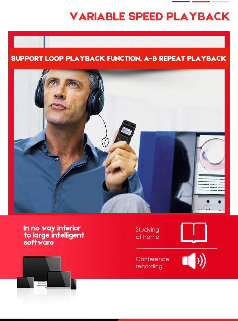 1. Формат записи: WAV MP3 2. Формат воспроизведения музыки: MP3/WMA/FLAC/APE/OGG lossless Music 3. Время записи батареи: около 145 часов 4. Время работы аккумулятора: около 60 часов 5. Аккумулятор: литиевая батарея 1450 мАч 6. Разрешение ЖК-дисплея: точечный экран 7. Интерфейс USB: высокоскоростной USB 2,0 8. Встроенный динамик: 20 мм * 30 мм 8 Омега/1 Вт 9. Рабочая температура: от 0 до 40 градусов 10. Запись частоты дискретизации: 48 кГц 11. Разъем для наушников: 3,5 мм, двойной трек 12. Разъем для подключения микрофона: 3,5 мм, двойной трек 13. Размер (мм): 100*36*12 (Д * Ш * Т) 14. Вес: 93 г 15. Совместимая система: Windows 2000 и выше