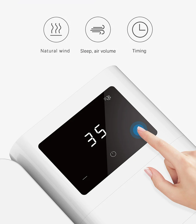 Сенсорный экран регулировки Несколько функций могут быть преобразованы по желанию. Три функции естественного ветра, таймера и режима сна можно переключать по желанию. Включите режим сна в ночное время, автоматически регулируйте скорость ветра и работайте с низким уровнем шума. Ветра.