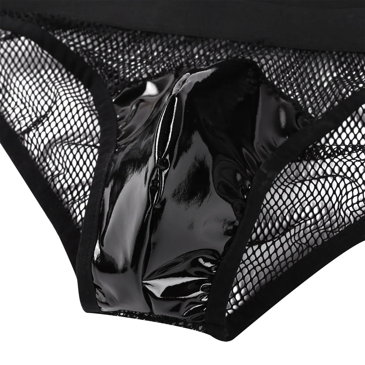 Низкая посадка с эластичным поясом для удобной посадки, спереди с мешочком из лакированной кожи, прозрачная в крупную сетку со сращенной задней частью.